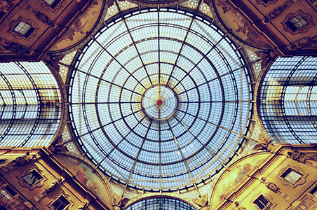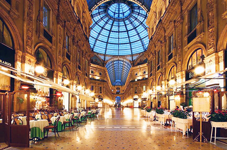 埃马努埃莱二世长廊是是⼀个带顶棚的拱廊街,两条玻璃拱顶的走廊交汇于中部的⼋角形空间,顶部是⼀个玻璃圆顶。它座落在米兰主教座堂广场北侧的显要位置,并连接斯卡拉广场。拱廊街得名于意⼤利统⼀后第⼀位国王埃马努埃莱⼆世,最初设计于1861年,并由朱塞佩·门戈尼(Giuseppe Mengoni)修建于1865年到1877年之间。欧洲最漂亮的商业拱廊之⼀,建于1865年至1877年,上面是钢架的彩色玻璃棚顶,两条交叉的长廊呈十字型,南北长198米,东西长105米。