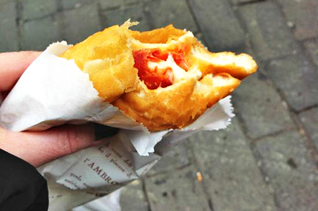 是一家专门热销意大利南部Panzerotti(有点像油炸包,里头包着番茄起司或者火腿起司),外皮松软又带点嚼劲,和番茄起司融合在一起非常美味。它就坐落在面对Duomo⼤教堂左手边的小巷⼦里。