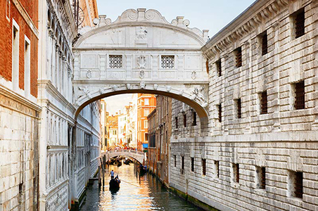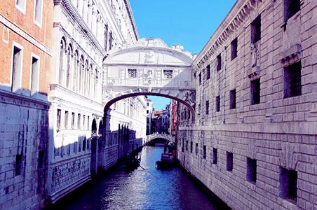 在总督府的后面,以前这里是犯人经过总督府通往后面监狱的必经之桥,因为犯人经过此桥时常忏悔而叹息而得名。游览时间同公爵宫。另外如果时间紧张,可以在外观看,其实就是一座封闭桥梁,连接公爵宫及牢房。叹息桥造型属早期巴洛克式风格,桥呈房屋状,上部穹隆覆盖,封闭得很严实,只有向运河一侧有两个小窗。当犯人在总督府接受审判之后,重罪犯被带到地牢中,在经过这座密不透气的的桥时,只能透过⼩窗看看蓝天,从此失去了自由,不自主的发出叹息之声。另外还有一个有趣的传说,一名死囚看见从前的恋人在桥的另⼀端与新欢亲热,不禁深深叹息。叹息桥从此成为了恋人见证爱情的地方,据说恋人们在桥下接吻就可以终生相守。电影《情定日落桥》(A Little Romance)就是在这取景的。 站在叹息桥上,应该能够真切的体会到往前一步是地狱,退后一步是天堂。