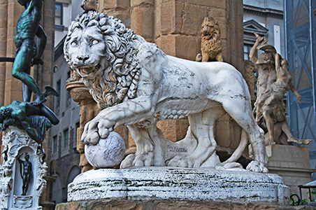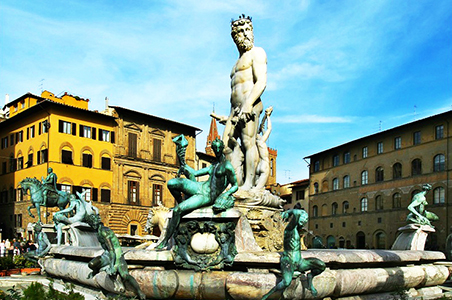 市政广场是因为它靠近市政厅而得名,⼜叫“领主广场”,它是佛罗伦萨市的中心广场,整个广场呈L型,广场不⼤但是广场上确有众多雕塑精品,在众多雕塑中最有名的当属米开朗基罗的⼤卫了,不过这里的⼤卫是复制品,真迹现藏于学院美术馆里。其他的还有海神喷泉、柯西莫⼀世骑马雕像、狮⼦雕像、帕尔修斯和美杜莎的头颅等等。市政广场是开放式的,周围环绕着旧宫、乌菲齐美术馆、佣兵凉亭和众多的咖啡厅、酒吧。在广场上还有许多街头艺人和小丑。