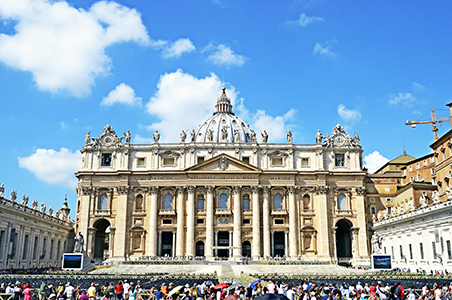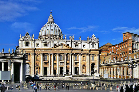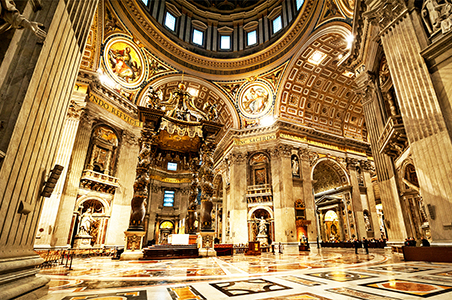 圣彼得大教堂(Basilica di San Pietro in Vaticano)建于16世纪,是世界上最大的天主教堂之一,也是天主教的中心。虽然不是罗马主教(教宗)的主教座堂,但仍被视为是天主教会最神圣的地点。圣彼得⼤殿是著名的天主教朝圣地点之⼀。教宗每年会在此举行多个仪式,每次约有一万五千人到一万人参与。圣彼得大殿与基督教历史上许多事件都有很强的关联,早期基督教、教宗国、宗教改革、反宗教改革等等。圣彼得大殿建于1506年至1626年。教堂中央是直径42米的穹窿,顶高约138米,前面有两重用柱廊围绕的巴洛克式广场。占地23,000平方米,可容纳超过六万⼈,这个伟大的建筑是众多建筑师艺术家倾尽全⼒建造的,广场的设计师是贝尼尼。堂内保存有欧洲文艺复兴时期许多艺术家如米开朗基罗、拉斐尔等的壁画与雕刻。