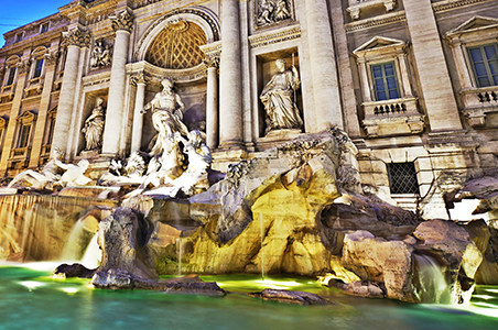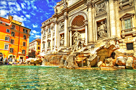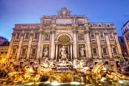 特莱维喷泉人称少女喷泉,更为人所熟悉的名字是许愿池。其实“特莱维”是三岔路⼝的意思,最早这个位置正好是个三岔⼝。而据传说公元前19年,一罗马技师为了帮助一位少女,特意从13公里外将水引⼊这个地区,这条水道因此被称为少女水道,之后所建的喷泉也叫少⼥喷泉。喷泉依波利侯爵宫殿而建,历时30年于1762年完⼯。主题是海神尼普顿胜利归来。我们看到站在正中海贝形战车上的就是尼普顿,脚下拉车的两匹骏马被两个特里同牵引,左边的狂放不羁,右边的温顺安详,分别象征汹涌和平静。海神左右各有一位女神,分别代表丰裕和健康。背景墙柱子顶端有四位女神持不同神器,象征四季。会赚钱的罗马⼈编了个故事,背朝喷泉右手持硬币通过心脏所处一侧的左肩向后抛出,投一枚硬币到池中许愿可以再次回到罗马,重复同样动作投两枚许愿将有艳遇,投三枚许愿则爱情梦想成真。